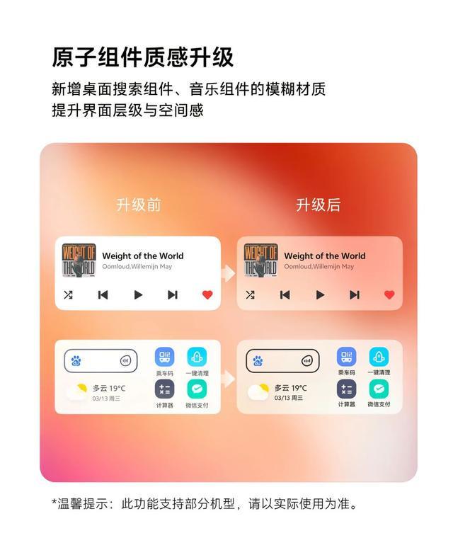 - 原子组件质感升级,新增桌面搜索组件、音乐组件的模糊材质,提升界面层级与空间感。