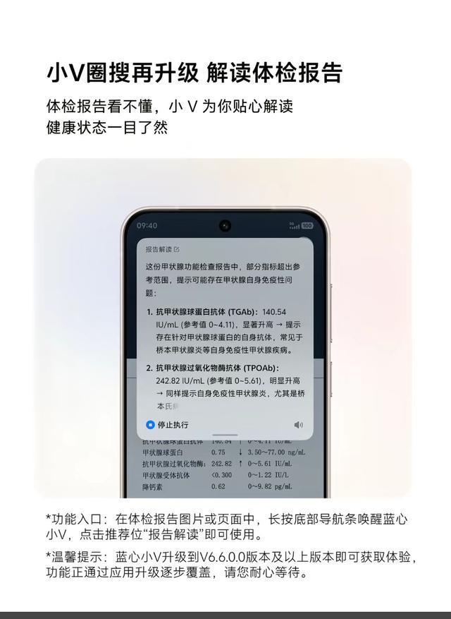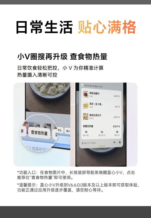 - 健康助手:“小v圈搜”功能升级,新增体检报告解读食物热量查询。对准报告单或食物图片圈选,即可获得蓝心大模型的贴心解读。