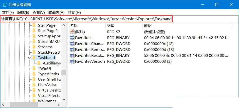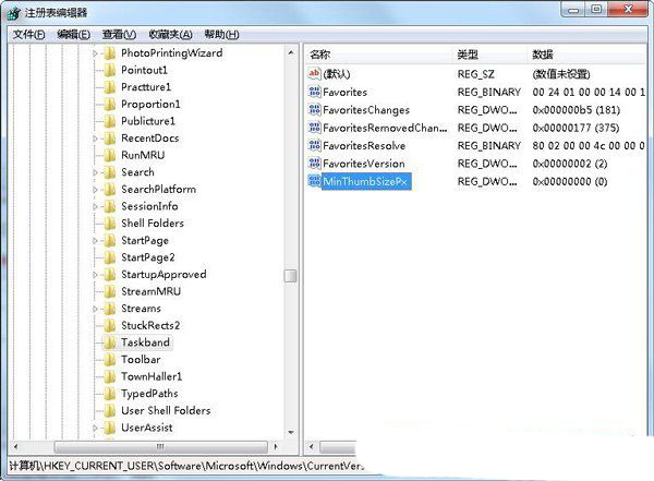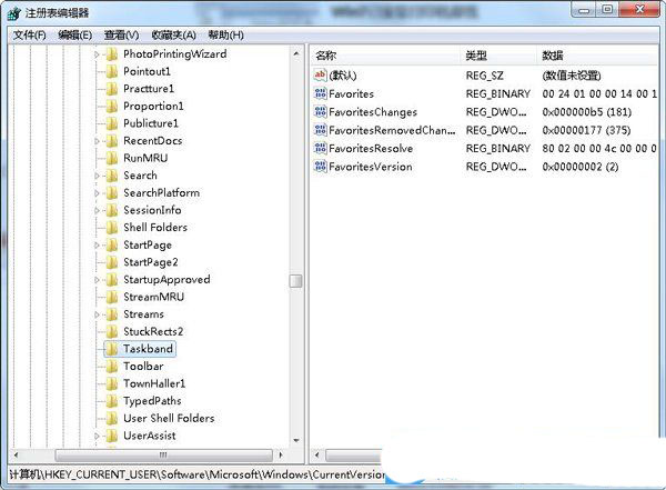 2、注册表编辑器窗口中,依次展开到以下路径:计算机hkey_current_usersoftwaremicrosoftwindowscurrentversionexplorertaskband