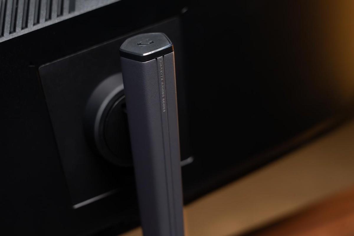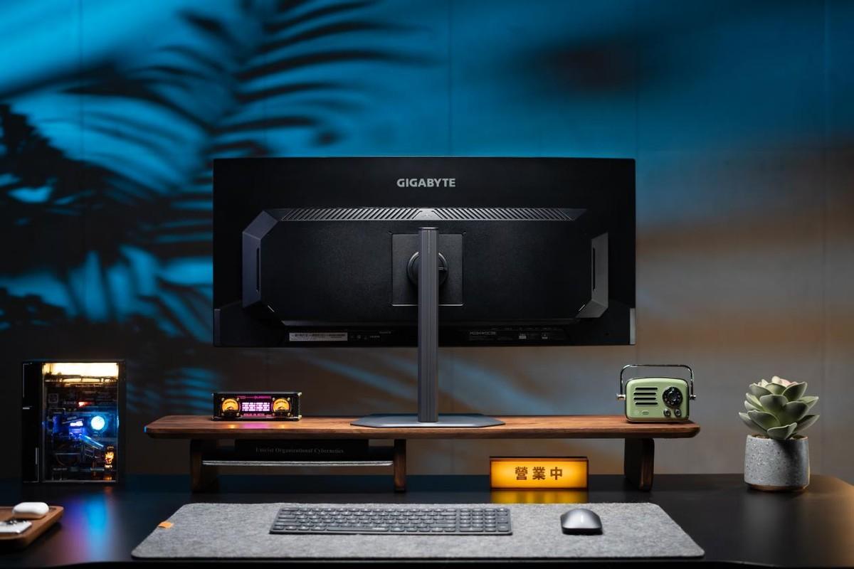 因为产品采用的是oled面板,屏幕边缘部分厚度控制得非常不错,再加上三面超窄边框、2mm超薄底座以及小巧的圆柱形支架,所以即便屏幕尺寸达到了34英寸,技嘉mo34wqc36反而让我有纤薄视觉感受。同时显示器外观设计较为简约,机身并无太多造型,通体为深灰色,整体气质简约低调。
