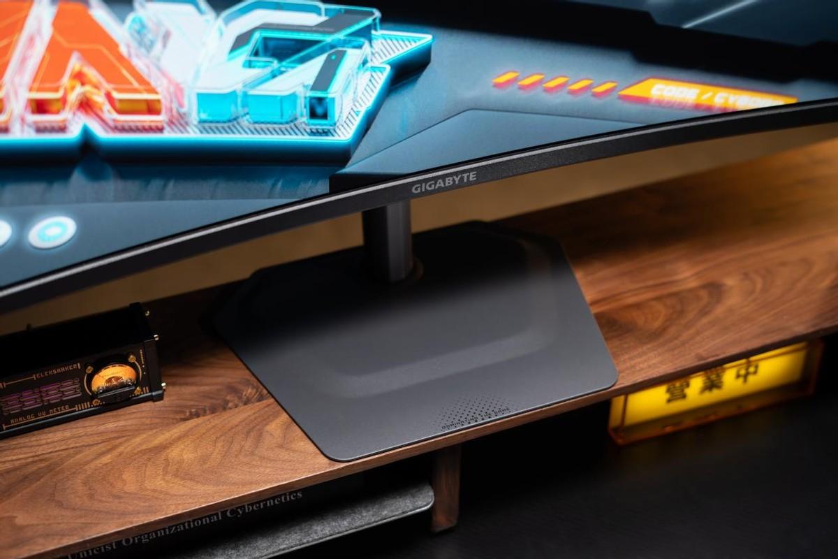 显示器的支架具备人体工学设计,除了因屏幕长度达到811.7mm,无法实现90°旋转之外,支持屏幕130mm高度调节、-5°~21°的俯仰调节、-15°~15°左右水平旋转,调节时的阻尼感紧实,操作很跟手,便于玩家调整到最为舒适的观看角度。同时技嘉mo34wqc36的底座虽然很薄,但是面积够大,足以保证屏幕放置的稳定。