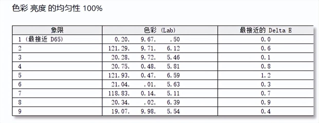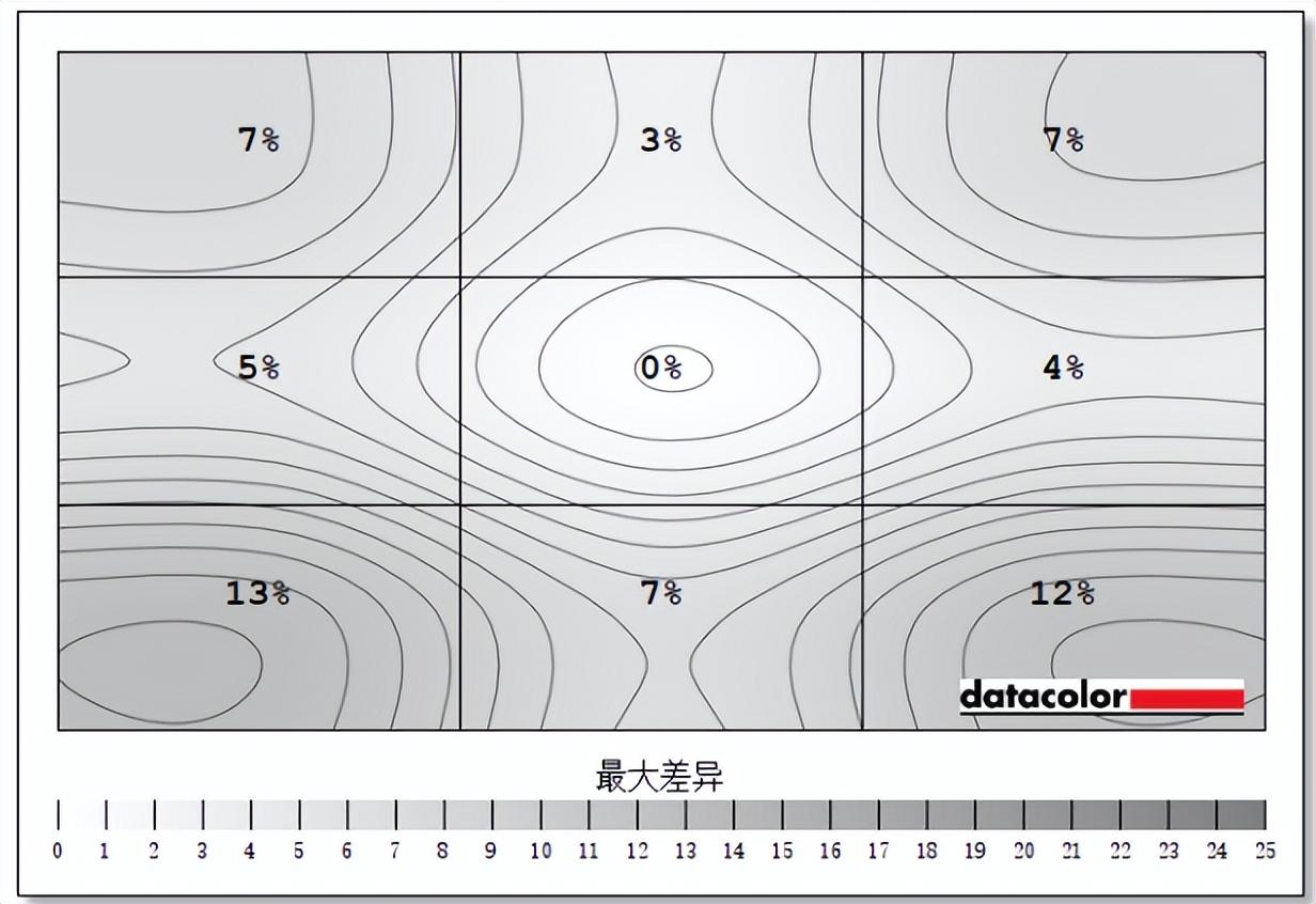 为了验证技嘉mo34wqc36真实的色域和色准表现,我们借助spyder x2 ultra校色仪进行了测试,测试前我们将显示器恢复出厂设置并预热一个小时。从测试结果来看,显示器在默认的标准模式下的srgb色域覆盖为100%、dci-p3色域覆盖为97%,色域覆盖表现非常出色。特别值得注意的是,按照笔者以往的经验,曲面屏显示器在均匀性方面的表现较为一般。不过技嘉mo34wqc36在100%亮度下,屏幕各区域色差最大delta e值也不过1.2,亮度差距最大也只有13%,整体表现也是相当出色。
