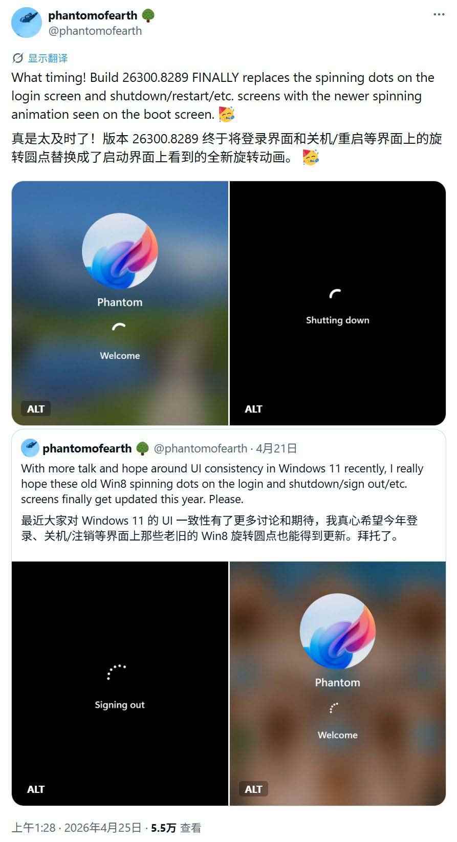 消息源 @phantomofearth 于 4 月 25 日在 x 平台发布推文,指出在 windows 11 dev 频道 build 26300.8289 预览版中,微软清理 windows 8 系统的残留界面,调整登录、注销和重启界面加载动画。