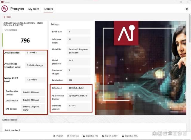 当切换为ai boost选项后,测试时间有所变长,酷睿ultra 7 265k总体得分为796,总体图像生成速度为39.249 s/image,平均unet速度为1.31 it/s。