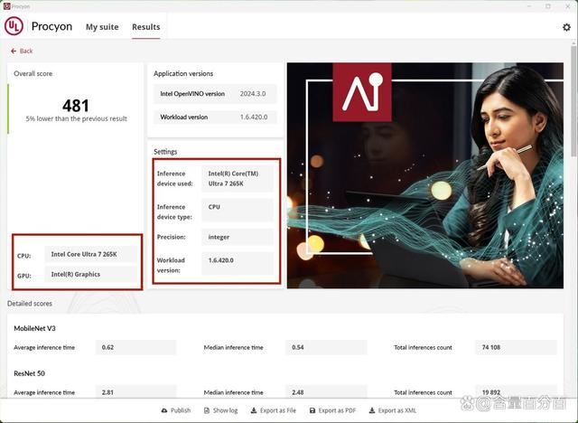 al computer vision benchmark这块在intel openvino功能下进行测试,分别对cpu、igpu和npu进行测试,选择的模式均为integer,酷睿ultra 7 265k在cpu+integer分数为481。