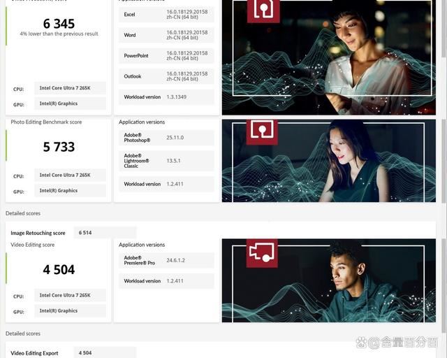 生产力相关,我这里搭配了office productivity benchmark、photo editing benchmark、video editing benchmark这三件套进行测试,对应的测试结果分别是6345、5733、4504,注意这里仍旧没有安装独立显卡。