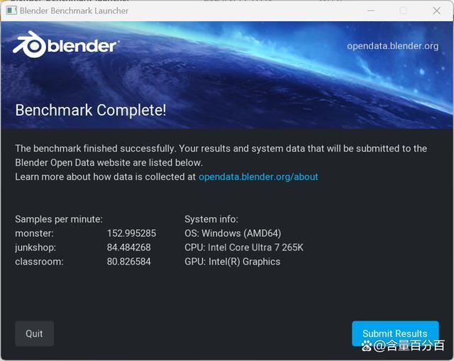 酷睿ultra 7 265k在blender benchmark 4.2下的测试结果如下,cpu模式下monster对应的数据为212.631983,junkshop对应的数据为143.513866,classroom对应的数据为105.757855。