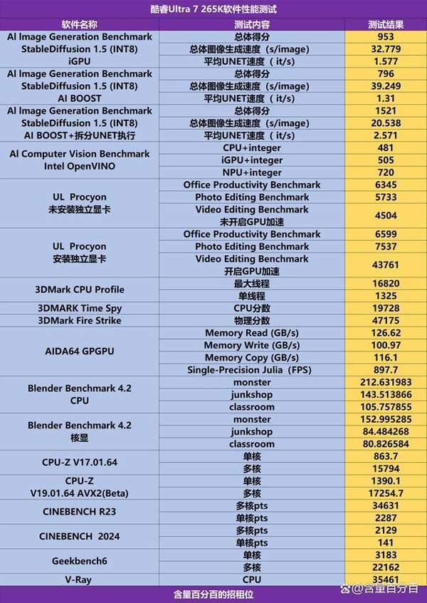 这里做一张汇总表格方便各位参考。这里做一张汇总表格方便各位参考。从测试结果来看,酷睿ultra 7 265k在单核性能方面和生产力相关的性能表现还是比较出色。