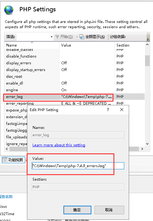或指定文件路径"c:\windows\temp\php-7.4.9_errors.log")。