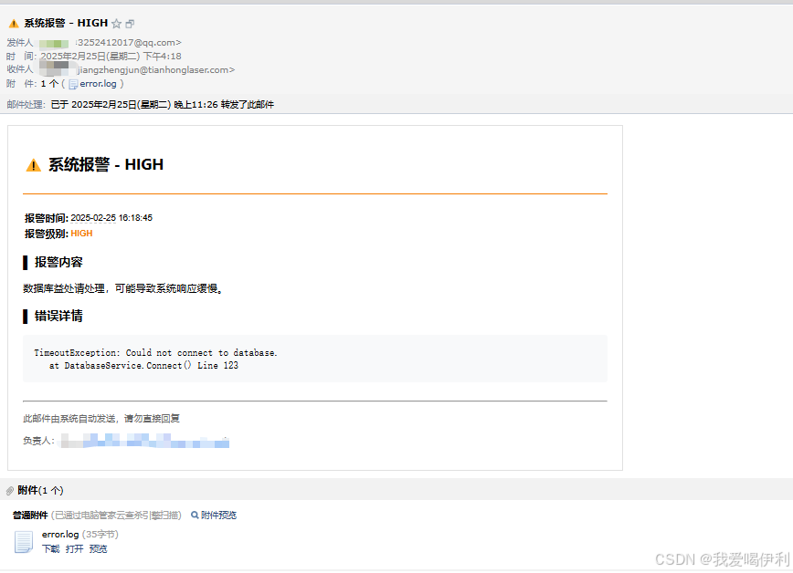 //1和2是会在程序运行的文件夹中生成一个日志文件,当同一个报错今天已经发送过了,将会 //不再发送,防止报错一直触发然后一直给自己发送邮件,这样子抽牛马干活打在自己身上就太痛了